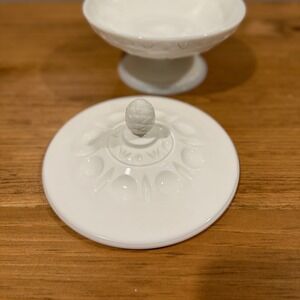 Keywords: milk glass, vintage dish, compote bowl, covered candy dish, pineapple finial, embossed glass, pedestal dish, decorative accent, kitchen decor, table centerpiece, retro serving, shabby chic
