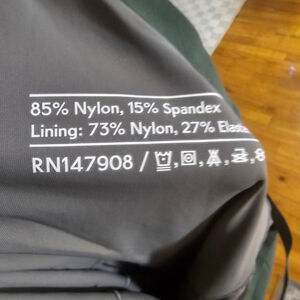 The fabric composition is 85% Nylon and 15% Spandex, with the lining being 73% Nylon and 27% Elastane. The dress measures approximately 13.5 inches across the bust and 30 inches in length. There are visible wrinkles throughout the fabric, consistent with normal wear or storage.