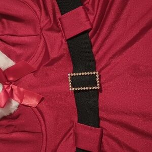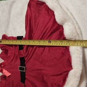 Festive red chemise with white fur trim. Features a playful black belt detail. Perfect for holiday celebrations.