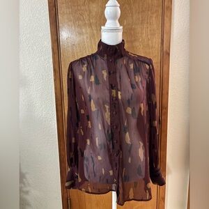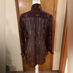 Stylish burgundy shirt with tan accents. Perfect for casual wear. Button-down design. Sheer blouse perfect for layering.