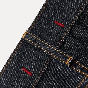 High rise jeans made of cotton blend fabric. Belt loops and five pockets. Pronounced contrasting topstitching detail. Straight leg. Front zip and button closure.