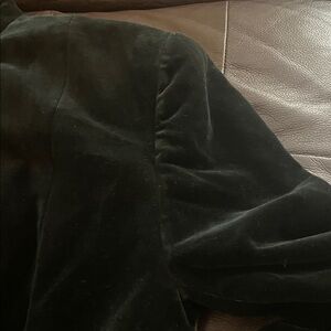 This elegant black velvet Doncaster. jacket features a sophisticated design with gold button detailing. Perfect for adding a touch of luxury to any outfit. 20” pit to pit. 31” in length. 100% cotton. Buttons are a medium weight. Rolled cuff with buttons. Inside lining. Built in shoulder pads. Slight princess sleeve at the shoulder. Size 8.