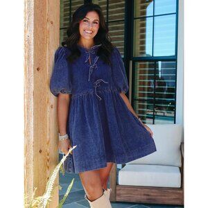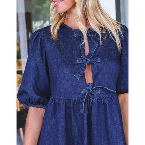 Features: Cute puff short sleeves and a playful bow-tie neckline that you can adjust for sweet or sophisticated vibes. Made from lightweight, structured denim that moves comfortably and keeps its shape. The babydoll silhouette is flattering and fun.