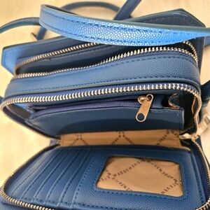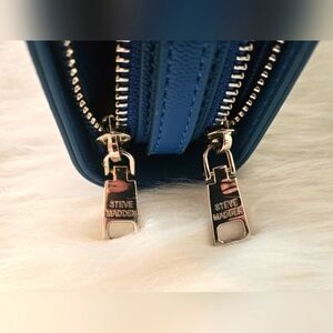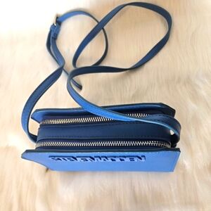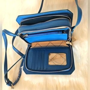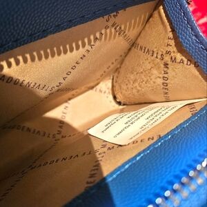 This vibrant cerulean blue Steve Madden crossbody bag is a stylish throwback with modern functionality. The smooth blue logo takes center stage on the front, adding a bold signature touch. Thoughtfully designed with two compartments, dual zippers, two interior zippered pockets, six card slots, and three storage sleeves, it keeps essentials neatly organized. The adjustable crossbody strap ensures a perfect fit, while the sleek logo-lined interior adds a refined finish. Only found flaw are small spots on the inner lining of one of the zippered pockets. Photo provided, price adjusted.