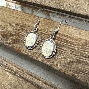 Authentic Sterling silver MC 925 stamped great shape white mother of pearl mosaic oval dangle drop French wire solid well made earrings with gift box. 1.25 X .5”