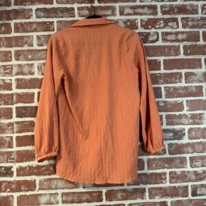 Khaadi 2-piece crinkle lounge set in a peachy orange shade. Includes long sleeve button-front top with balloon sleeves + matching elastic waist wide-leg pants.