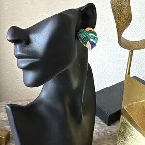 Bohemian green and blue leaf stud earrings in gold hardware