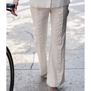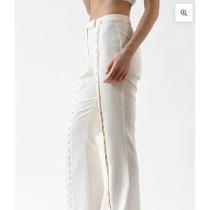 The Fabio Snap Trouser is a mid rise pant, crafted with a crisp ivory linen fabrication. It features linen-covered snaps down the front and an extended tab at the waistband.