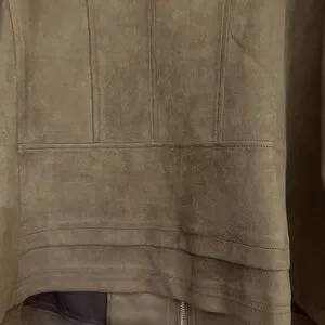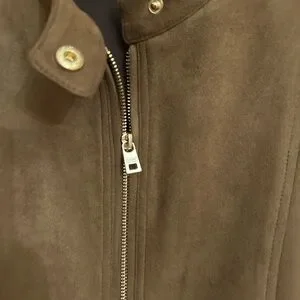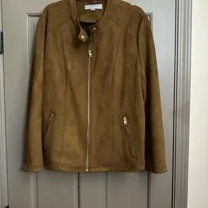 Stylish tan microsuede jacket with zip closure. Features two front zip pockets. Super stylish looks great and a dressy setting or with jeans! Only worn once or twice so still like brand new. From a smoke and pet free, clean home.
