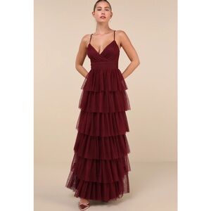 Lulus Rule The Runway Burgundy Tulle Surplice Tiered Maxi Dress Small NWT