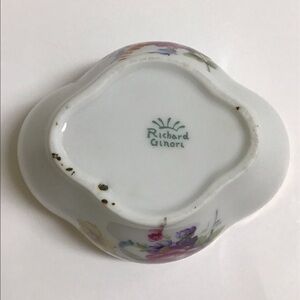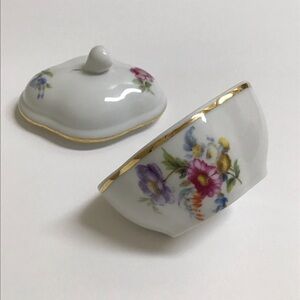 Lovely vintage porcelain oval trinket box with floral theme, gold accent rim and white pear finial lid.