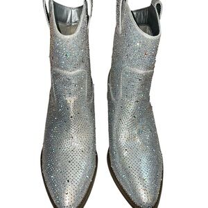 Gorgeous pointed toe western bootie, rhinestone details throughout, wooden block heel, pull on style fit