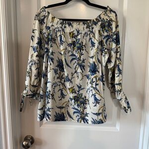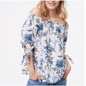 LOFT Off-Shoulder Floral Blouse - Blue and White Block Print