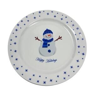 Adorable seasonal festive blue and white Stoneware Snowman & star "Happy Holidays" graphics matching Christmas dish set