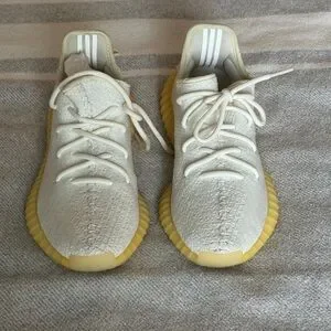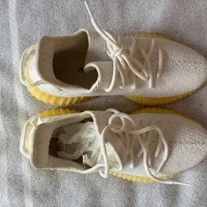 Stylish cream sneakers with yellow soles. Perfect for casual wear.