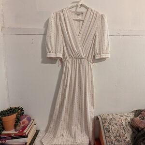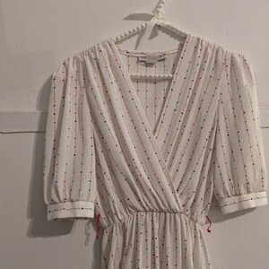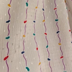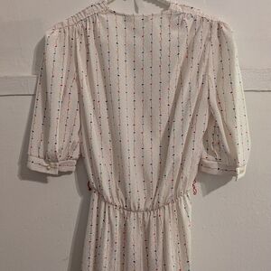 Vintage Wrap V-neck Dress w abstract multicolor dots and swiss dot pattern. Extremely lovely and imo perfect for the holidays because I think the colorful dots look like Christmas lights. Very good vintage condition. Fits size small. Very cute with a belt, has red loops for a belt. Knee length.