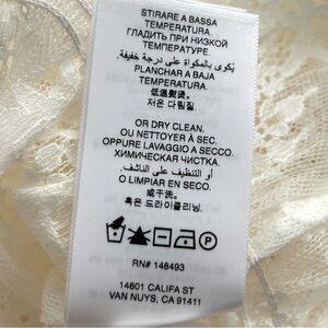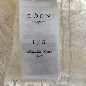 Doen, Salt (cream) Lace Raquella Dress, New With Tag, Size L. Designed in intricate chantilly-inspired lace, the Raquella Dress is an easy-wearing pullover style with a bateau neckline trimmed with a ruffle, elbow-length double-puffed sleeves, and allover elasticized smocking. A fitted silhouette gives way to an ankle-grazing skirt with a scallop lace hem.