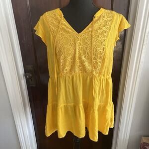 Pretty yellow tiered babydoll tunic top with floral lace panel and tie at neck