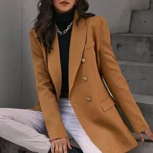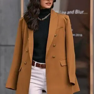 Khaki Elegant Women's Double Breasted Flap Detail Blazer Workwear