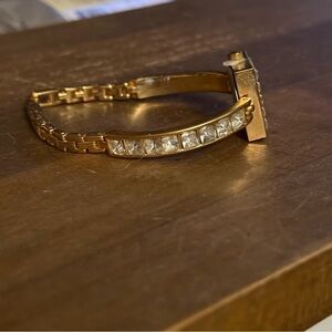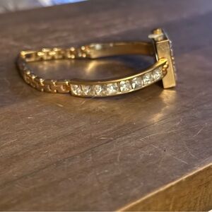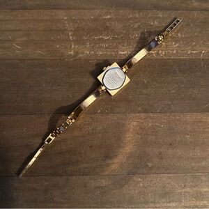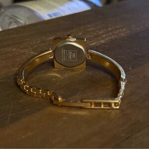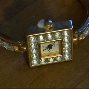 New. Still has the tab on the crown. Gold tone band with clear square crystals. Square case with clear crystals trim. White dial. Adjustable fold over clasp. Adjustable from 7”-7.5”. Not sure if it would need a new battery or not