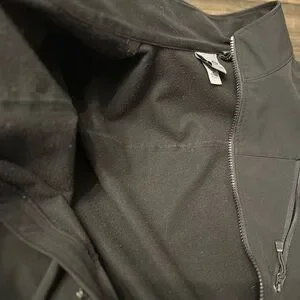 Sleek black windbreaker and rain jacket by Champion. Lined and durable. Ideal for outdoor activities.