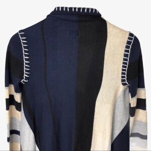 Features: long sleeve, open front, cascading front, Colorblock pattern in blues, black and natural, thick stitching outlines sweater