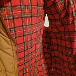 Stylish tan quilted vest with plaid lining. Features front pockets and a zip closure.