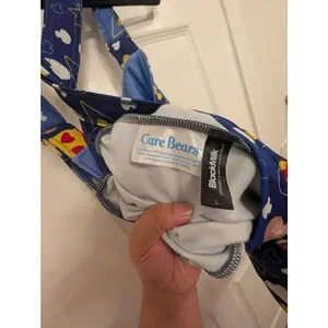 This is a BlackMilk x Care Bears women's overall in size L, featuring a vibrant blue fabric with a playful print of pizza slices, mushrooms, and clouds. The overalls have adjustable straps that cross in the back and two side pockets. A small black "BlackMilk" tag is visible on the side, and the inner tag confirms the "Care Bears" collaboration and "BlackMilk" branding, stating it's designed and made in Australia. The fabric appears to be a smooth, stretchy material. No significant imperfections are visible.