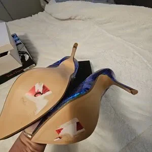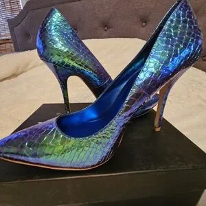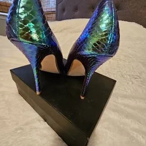 Elevate your look with these shimmering blue and green snakeskin heels. Perfect for adding a touch of glamour to any outfit.
