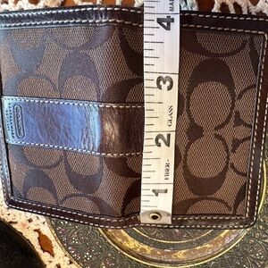 Elegant Vintage Coach ID wallet with signature pattern. Rich dark brown leather trim. The wallet is crafted from a combination of Coach's signature canvas and refined calf leather or polished pebble leather. It has a bifold design or a flap closure, including features like an ID window, card slots. Barely used still new.