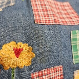 Patchwork squares and floral embroidery on the front