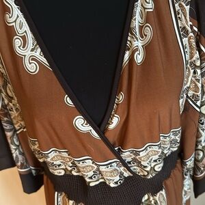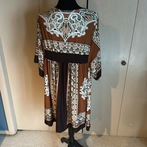 Stylish brown dress with intricate patterns. Features a flattering V-neck and short sleeves. Perfect for any occasion. Bohemian free spirit style. MUST BE BUNDLED with other items!