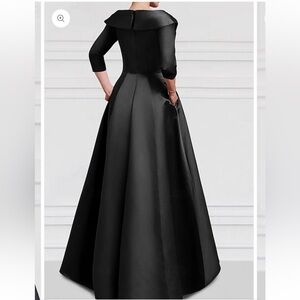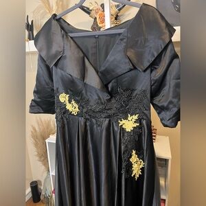 Embrace sophistication with this black gown, highlighted by elegant gold accents. Ideal for formal events.