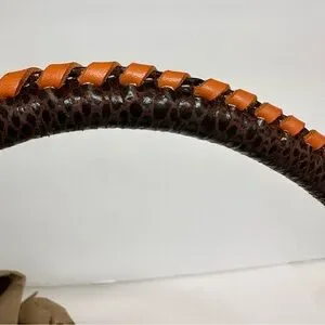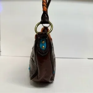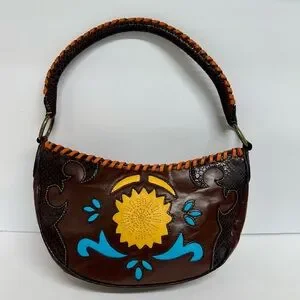 This vintage multi-colored dark brown shoulder bag features real calf leather and snakeskin, with orange and blue cutout patterns. Capture the cowboy inspired chic handbag with highlights and contrasting colors. That said, please remember that this is a vintage bag and has light aging—a stitch is missing here and there. Inspect the photos carefully and drop questions below!