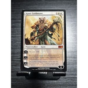 The product is a trading card from the Magic The Gathering franchise, specifically the Magic 2010 set. Produced by Wizards of the Coast, this non-sport trading card features the character Ajani Goldmane. As part of the popular Magic The Gathering series, this card would be sought after by collectors and players alike for its unique abilities and strategic value within the game.