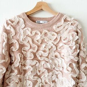 ZARA Blush Textured 3D Floral Appliqué Sweater Size Medium. Stylish blush pink sweater with ruffle details. Perfect for a trendy and cozy look. NEW!!
