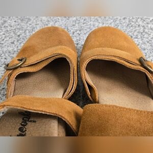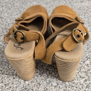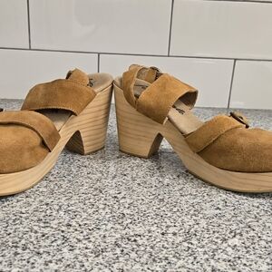 Stylish tan suede mules with a chunky wooden platform. Features adjustable straps for a secure fit.