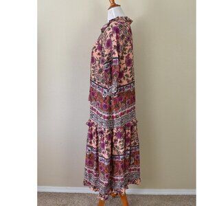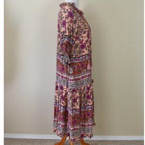 BTFL-LIFE Border Print Tiered Dress. Size L. Peach/pink background color with multi-color floral print. 3/4 sleeve. Ruffle trim. V-neck. Fully lined.