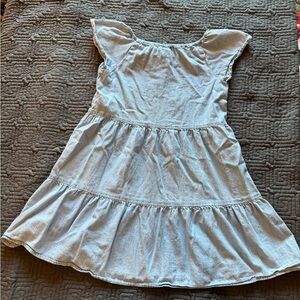Light blue dress with tiered design. Soft and comfortable for everyday wear. Features cap sleeves and a bow detail.
