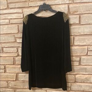 This elegant black top features stunning gold accents on the shoulders, perfect for adding a touch of sophistication to any outfit. Size 3