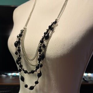 This exquisite necklace showcases a layered design with a silver-toned chain and multiple strands of black and clear beads. The mix of translucent and opaque beads adds depth and elegance, making it a versatile piece for any occasion.