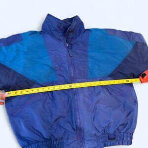 Authentic Vintage Brittania Outerwear blue color-block ski jacket, tagged Men’s Large but can fit unisex—please check measurements for best fit. Classic retro ski style with full zip front, adjustable cuffs, and warm inner lining.