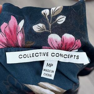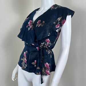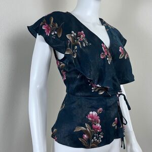 Collective Concept Size M Petite Green Pink Floral Satin Ruffle Wrap Blouse Top