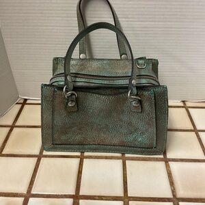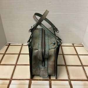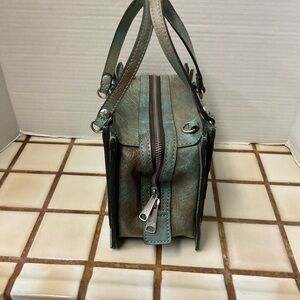 Stylish satchel with intricate design. Features brown and teal tones. Ideal for versatile use. Interior 1 zip pocket , credit card slots; faux suede lining. Exterior 1 front accordion style slip pocket , 1 rear slip pocket with magnetic snap closure. Dimensions 9 3/4” (W) x 6 3/8” (H) x 4 3/4 ((D), stand drop 22 1/2”-25 1/2” hand drop 6”. This purse was only used a couple times.