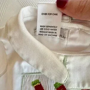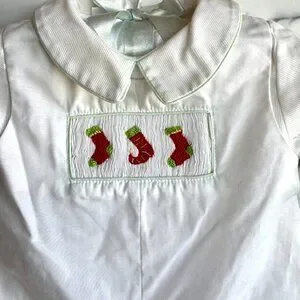Adorable Petit Ami long-sleeve Christmas romper featuring hand-smocked red and green stockings across the chest. Crisp white fabric with subtle green piping, Peter Pan collar, button-back closure, and snap bottom for easy changes. Perfect for holiday photos, Christmas parties, church events, and festive family gatherings.