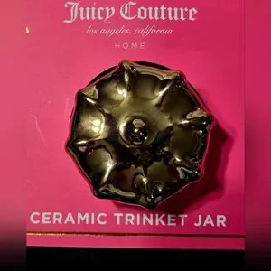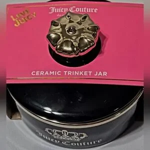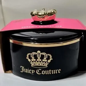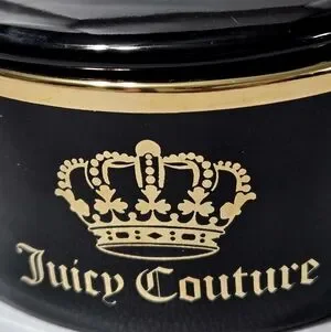 Elegant black ceramic trinket jar with gold accents. Features Juicy Couture branding and a crown design.