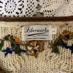 Incredible vintage grandmacore / cottagecore cable knit cardigan sweater with hand embroidery, wooden buttons, and chocolate brown velvet trim. Front pockets. Oversized.