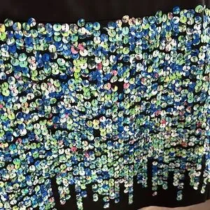 Chic mini skirt with shimmering blue and green fabric sequins. Ideal for a stylish evening.