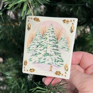 Excellent condition—used only a handful of times and mostly kept in storage. This beautiful retired Lenox porcelain Christmas card ornament features a charming snowy Christmas tree scene on both the front and back, with the front accented by gold holly leaves in each corner. Inside, elegant gold script reads “Season’s Greetings.” Comes with a gold tassel for hanging on the tree, or it can be displayed standing on its own as part of your holiday décor.