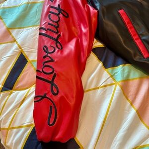 NWT! Authentic I Love Lucy Apparel - Black & Red Faux Leather Embroidered Bomber Jacket - brand new and beautiful!!! Has been covered in a large plastic bag, in the closet of a smoke-free home! โค๏ธ๐คโค๏ธ